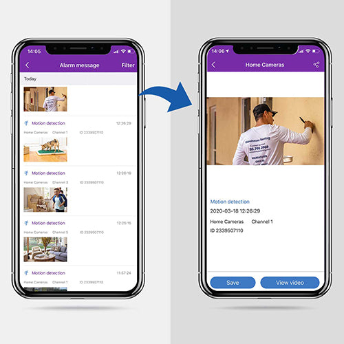 When motion detected, the camera sends you a message with snapshot. Tap to view a video clip to get more details.