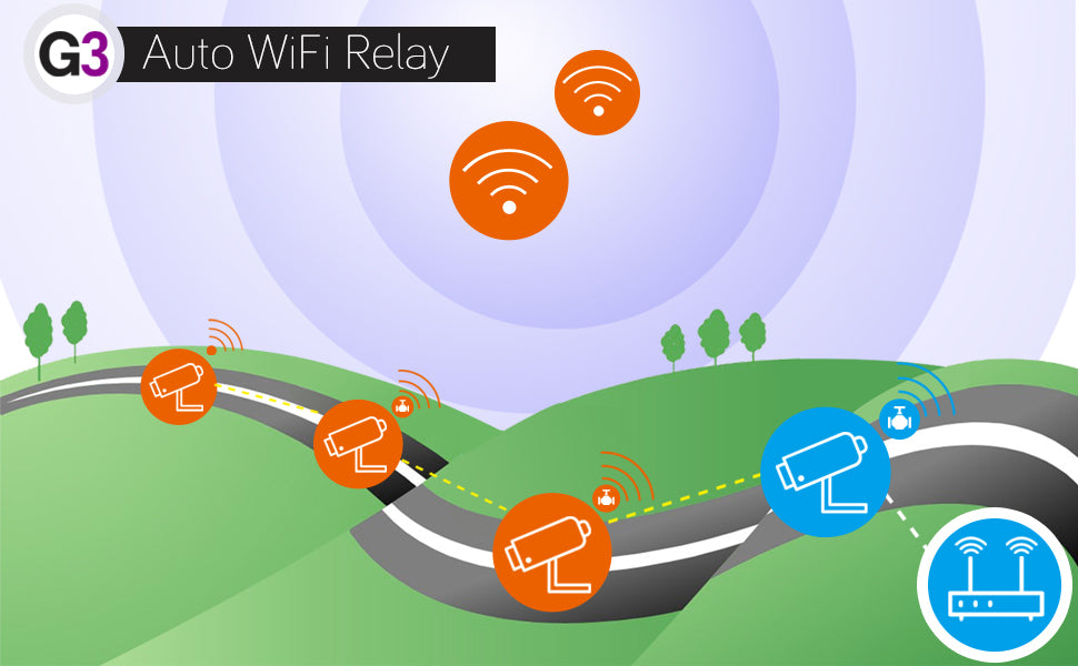 G3 Key Feature 1: AUTO-WiFi-Relay. Cameras with weak signal automatically repeat to close-by cameras and connect to the NVR. This boosts the camera mounting WiFi range automatically.