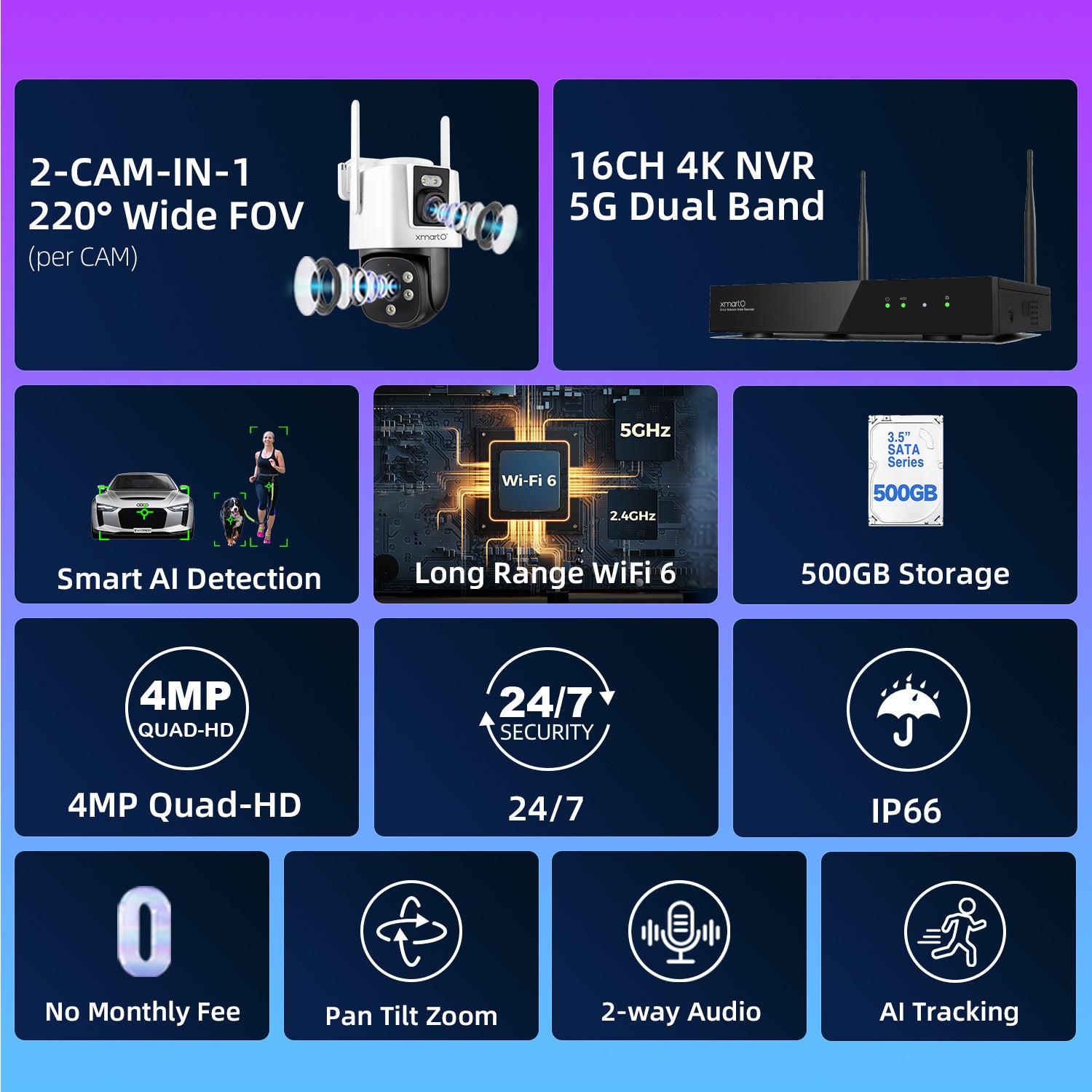xmartO [2-in-1 CAMs 8-View WiFi 6 Mesh PTZ Security Camera System Outdoor Wireless, 4X Dual-Lens CAM, 16CH 4K Long Range WiFi6 Surveillance NVR Kit, 4MP PTZ Home CCTV Set w. 500GB HDD, No Monthly Fee