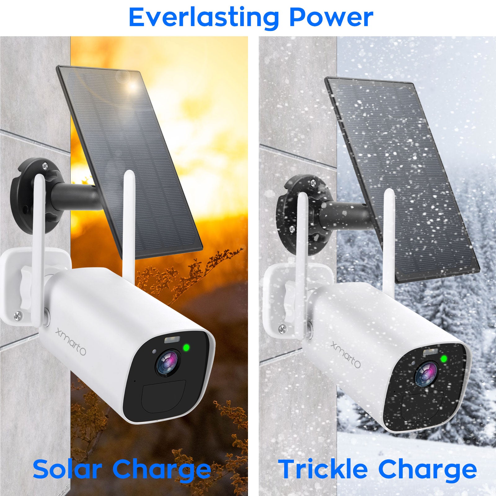 The camera features XMARTO's Trickle-Charge Technology In sunny days, the solar panel recharges fast and store power to the camera. In cloudy, rainy and snowy days, the solar panel charges the camera slowly with Trickle-Charge mode, ±12 hours per day. The all-weather recharging helps the camera to stay working without running out of battery.