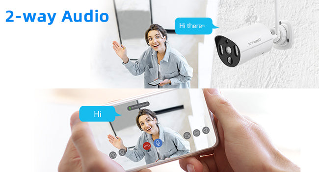 With Built-in microphones and speakers in cameras, you can hear and talk via the cameras from your phone. The NVR records all videos with audio.