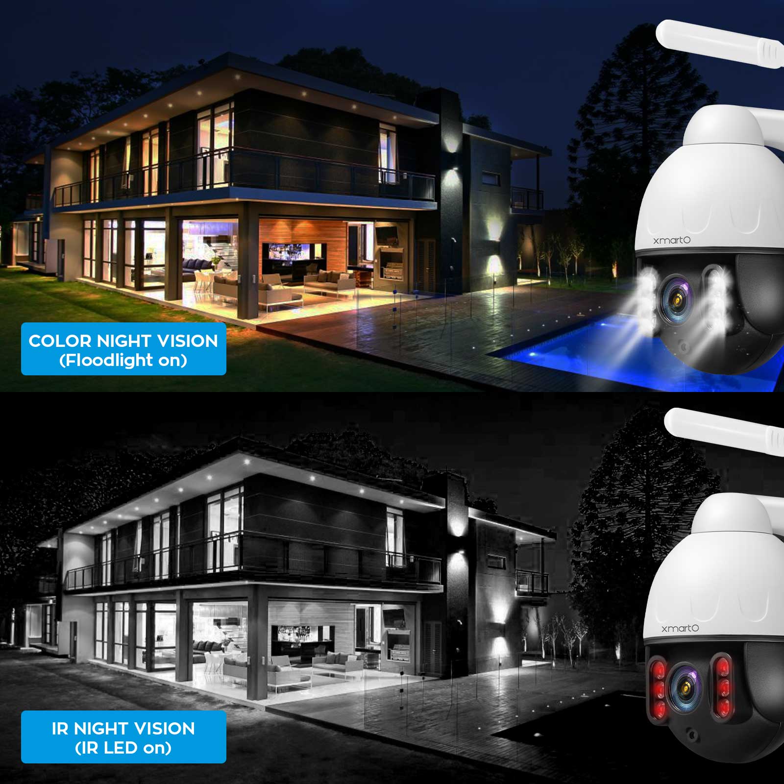 Smart Mode: At night IR LEDs turn on and camera see B/W night vision when no one is there. When the camera detects the motion movements, the Floodlights will be activated and turn to color night vision.