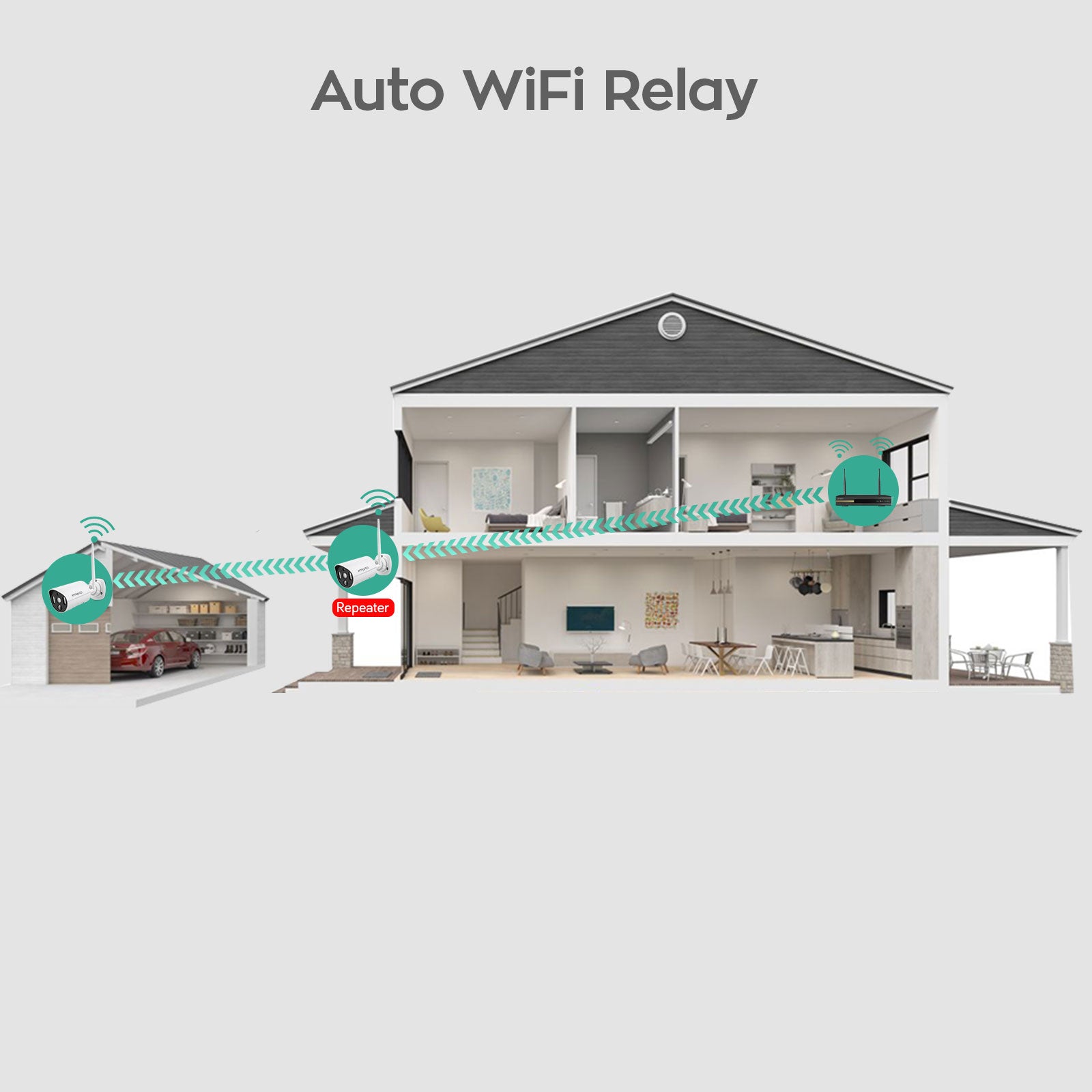 Powered with XMARTO's G3 Auto WiFi Relay technology, the security camera system automatically sets a closer camera as WiFi repeater for a further camera to boost its WiFi coverage. This gives you more flexibilities of where to mount the cameras.