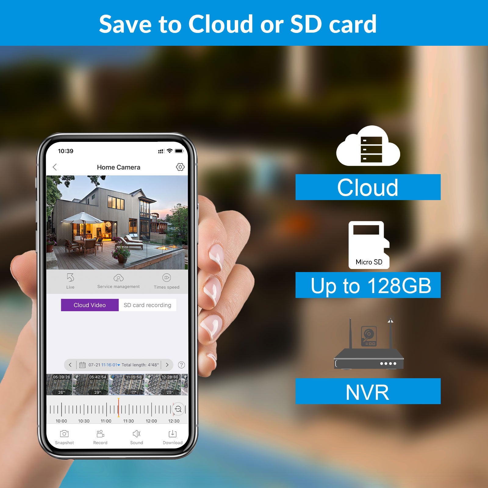 With Built-in microphones and speakers in cameras, you can hear and talk via the cameras from your phone. The NVR records all videos with audio.
