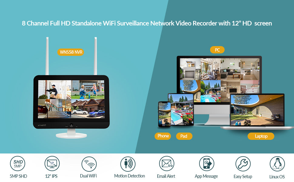 With 8 channels and 5MP super HD, WNS58 has vast compatibilities. You can add up to 8 xmartO WiFi cameras, from 720p cameras to 5MP cameras.