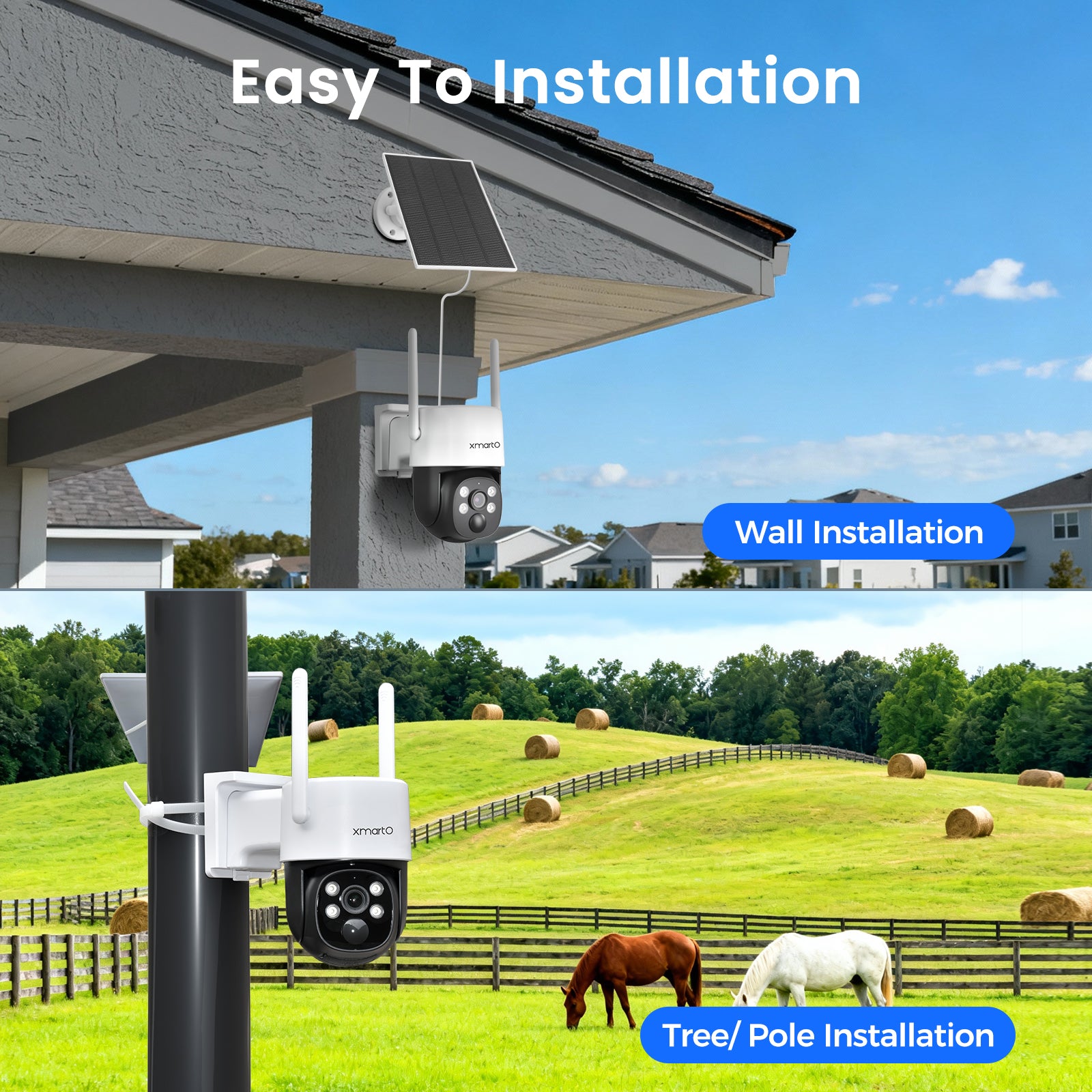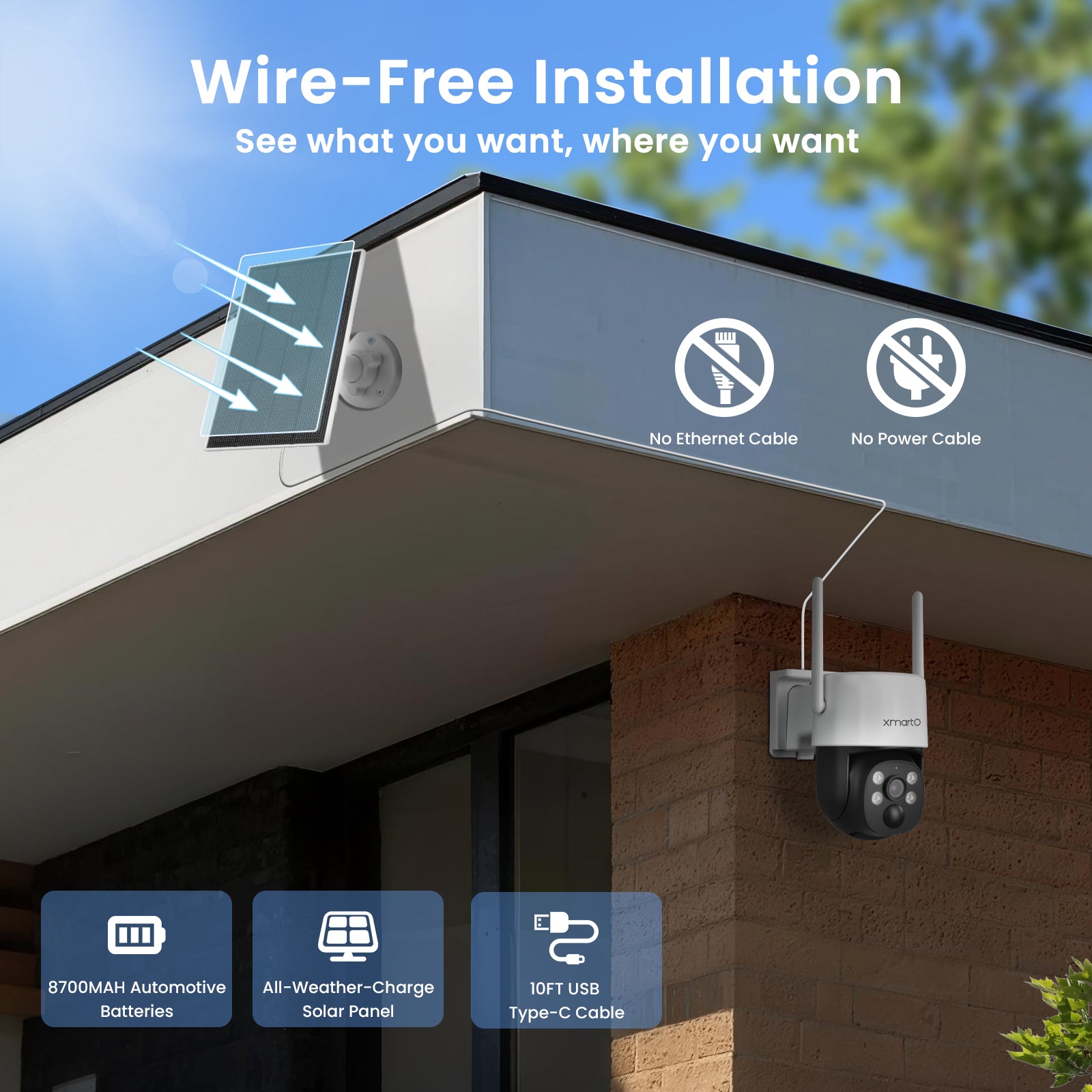 Powered with solar battery and long range WiFi, the cameras are wire free to install.
