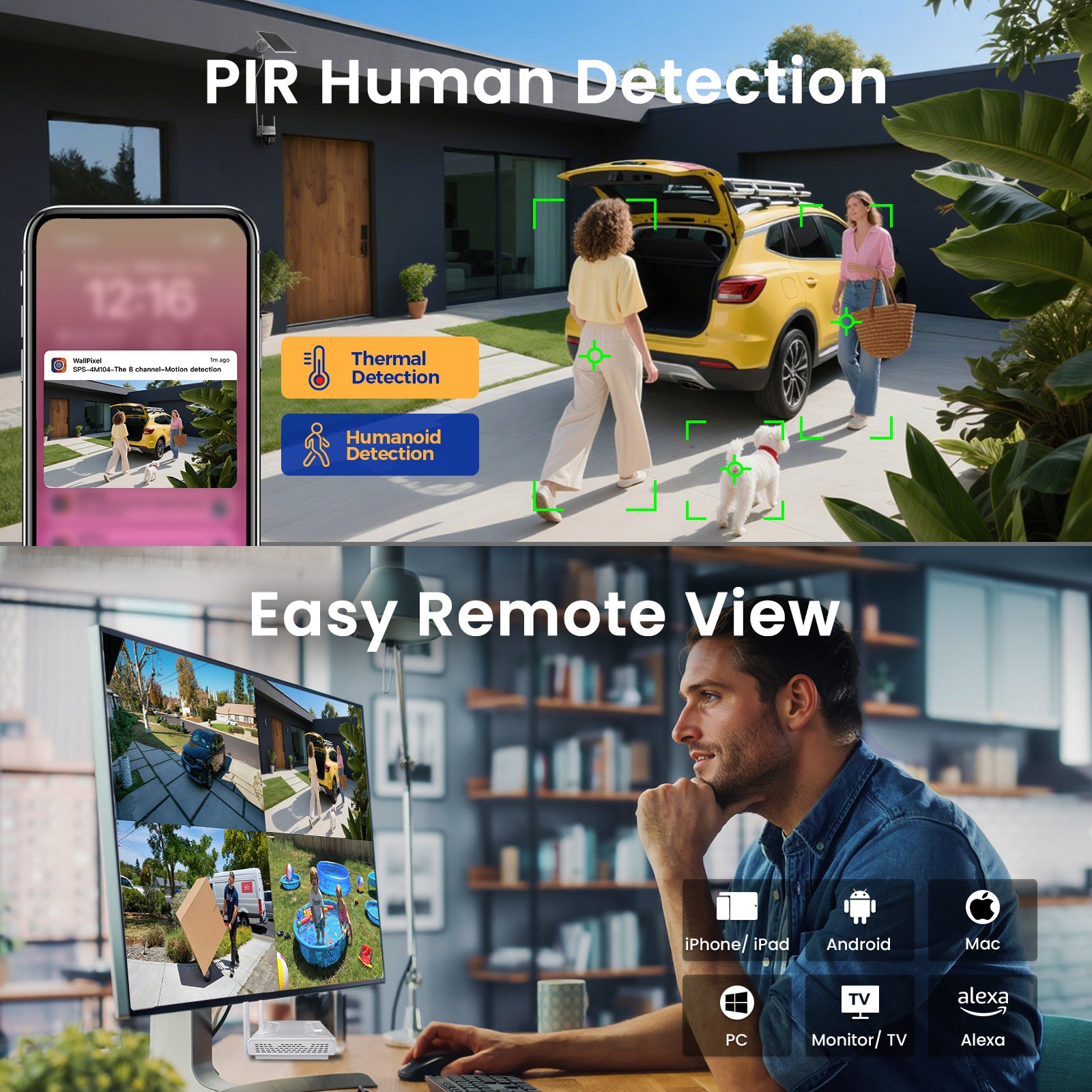 View from anywhere anytime from iPhone, Android, PC, Mac and Alexa.