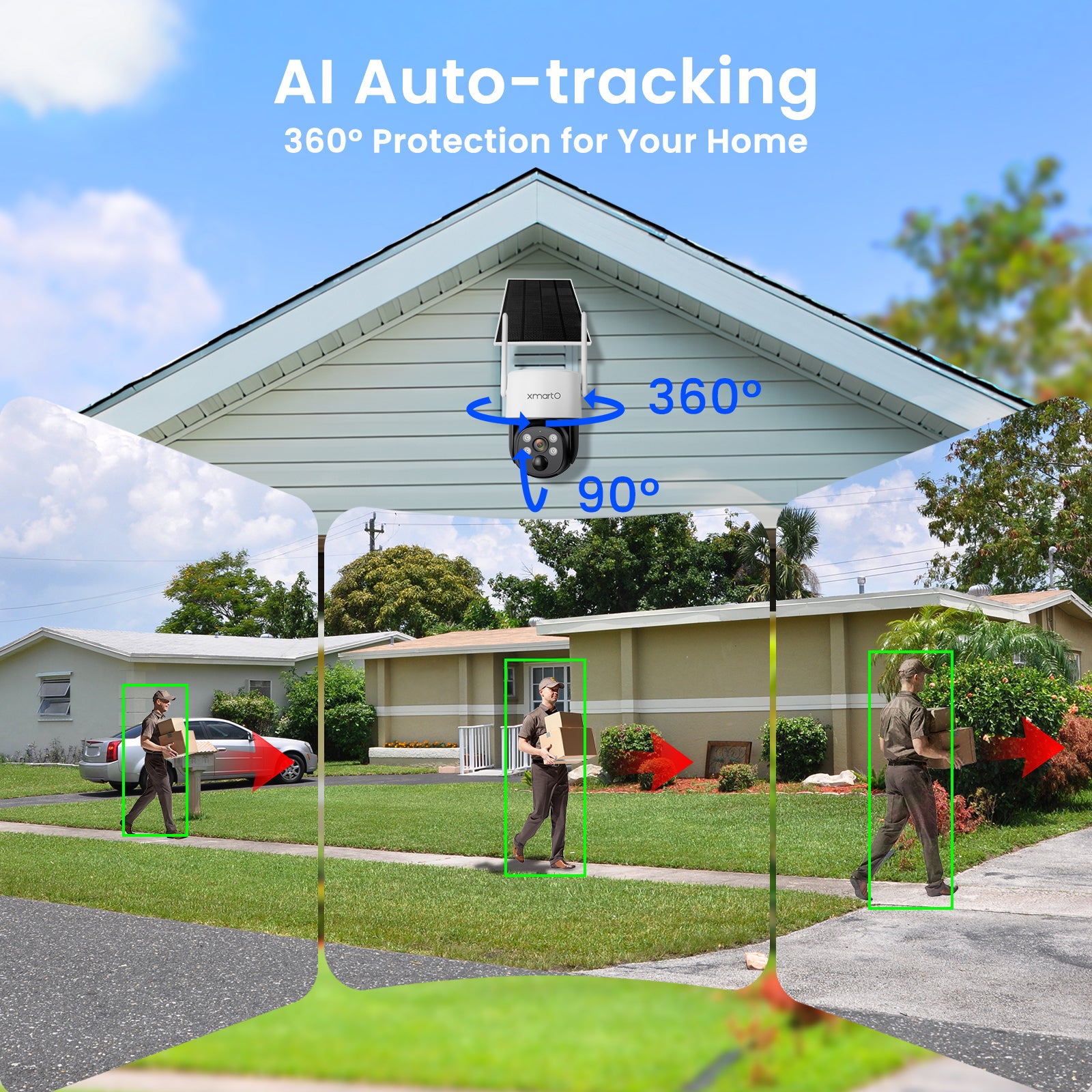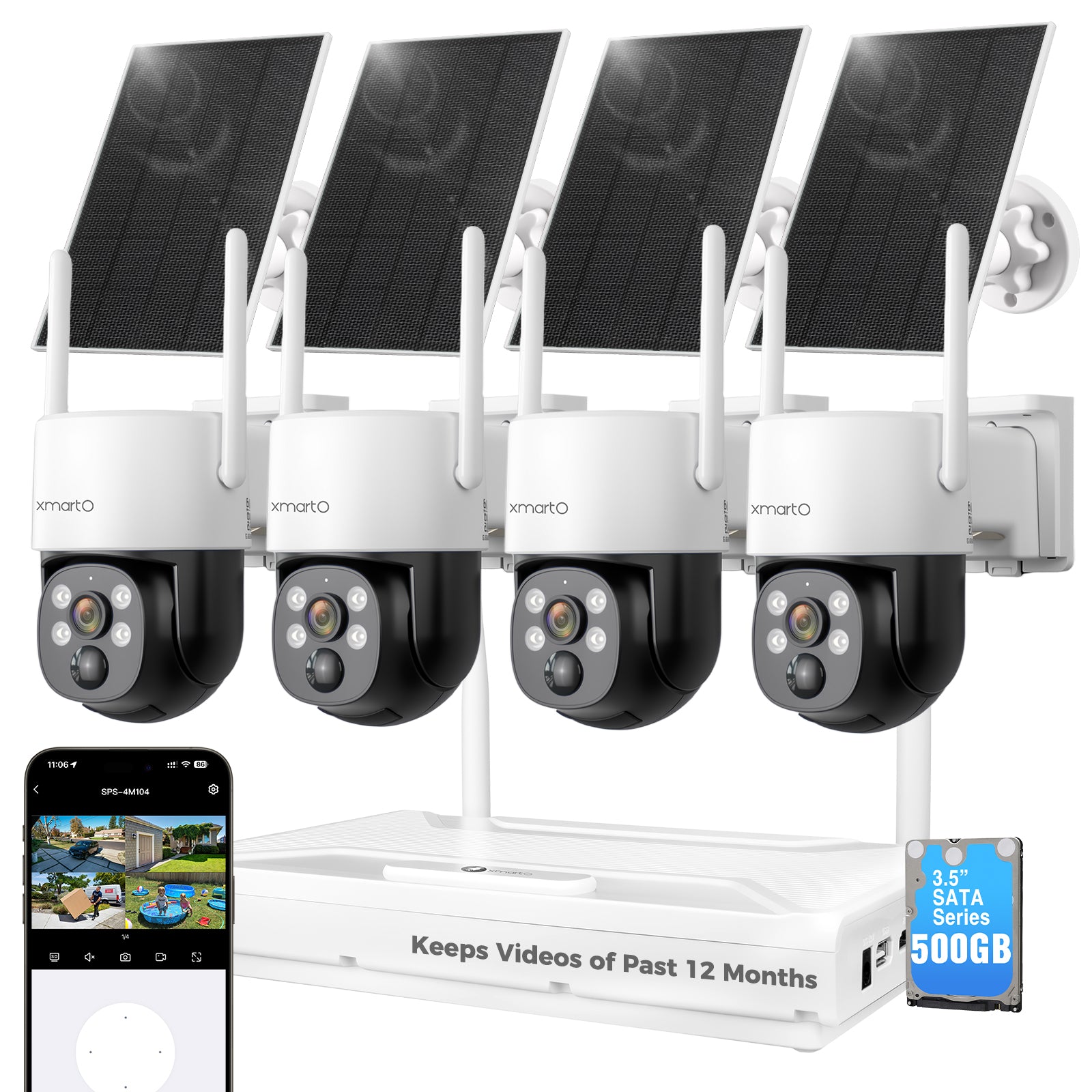 xmartO Solar Camera Outdoor Wireless, 4 PCs QHD 4MP Wireless PTZ Security Camera System with 4K 10CH Expandable WiFi NVR, All-Weather Solar Charge, Two-Way Audio, PIR Sensor, No Monthly Fee, 500GB