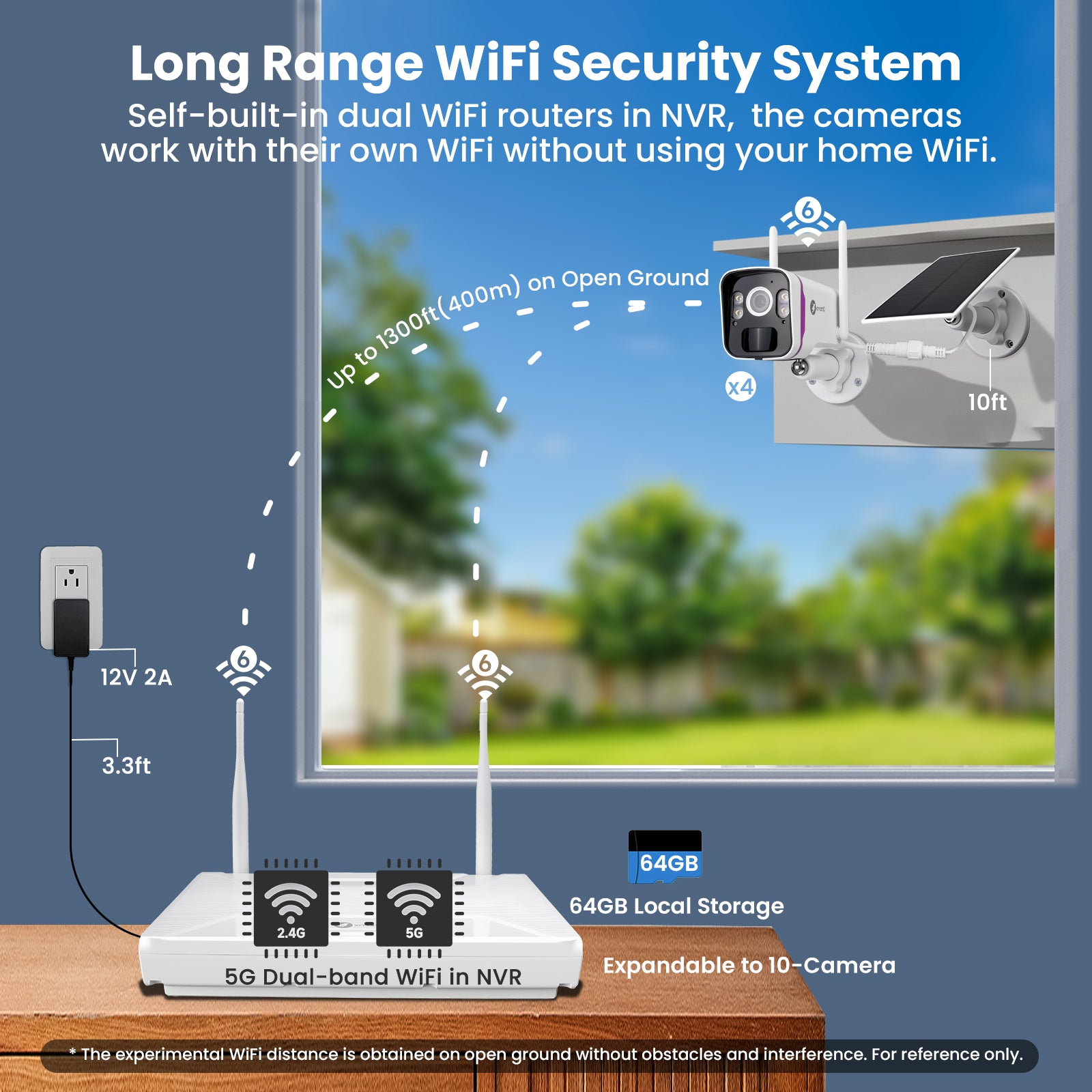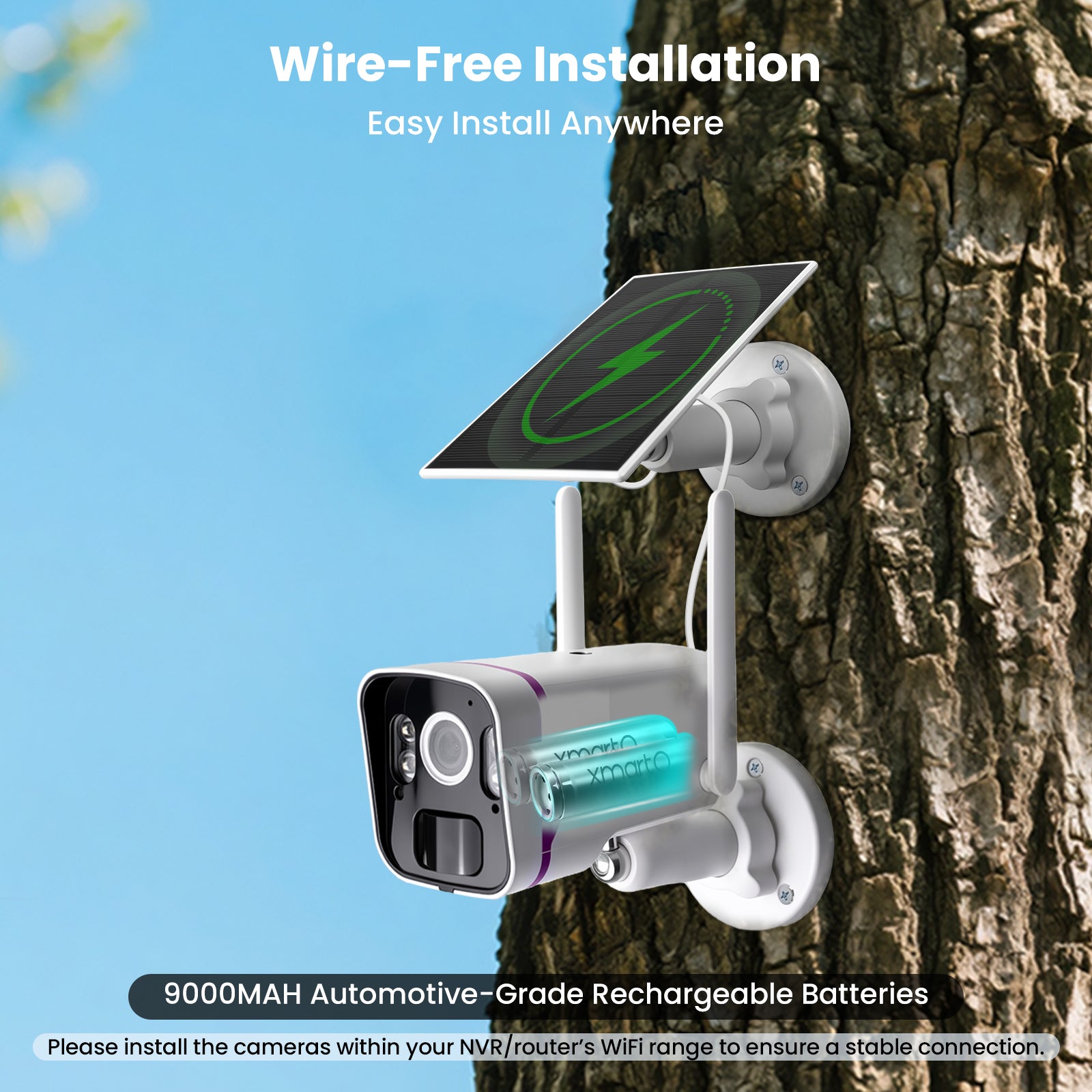 xmartO Solar Security Cameras Wireless Outdoor, WiFi6 NVR with 500GB HDD, 4 PCs 4MP QHD Home Security Camera System with 10CH Expandable NVR, Keeps Videos of Past 12 Months, All-Weather Solar Charge