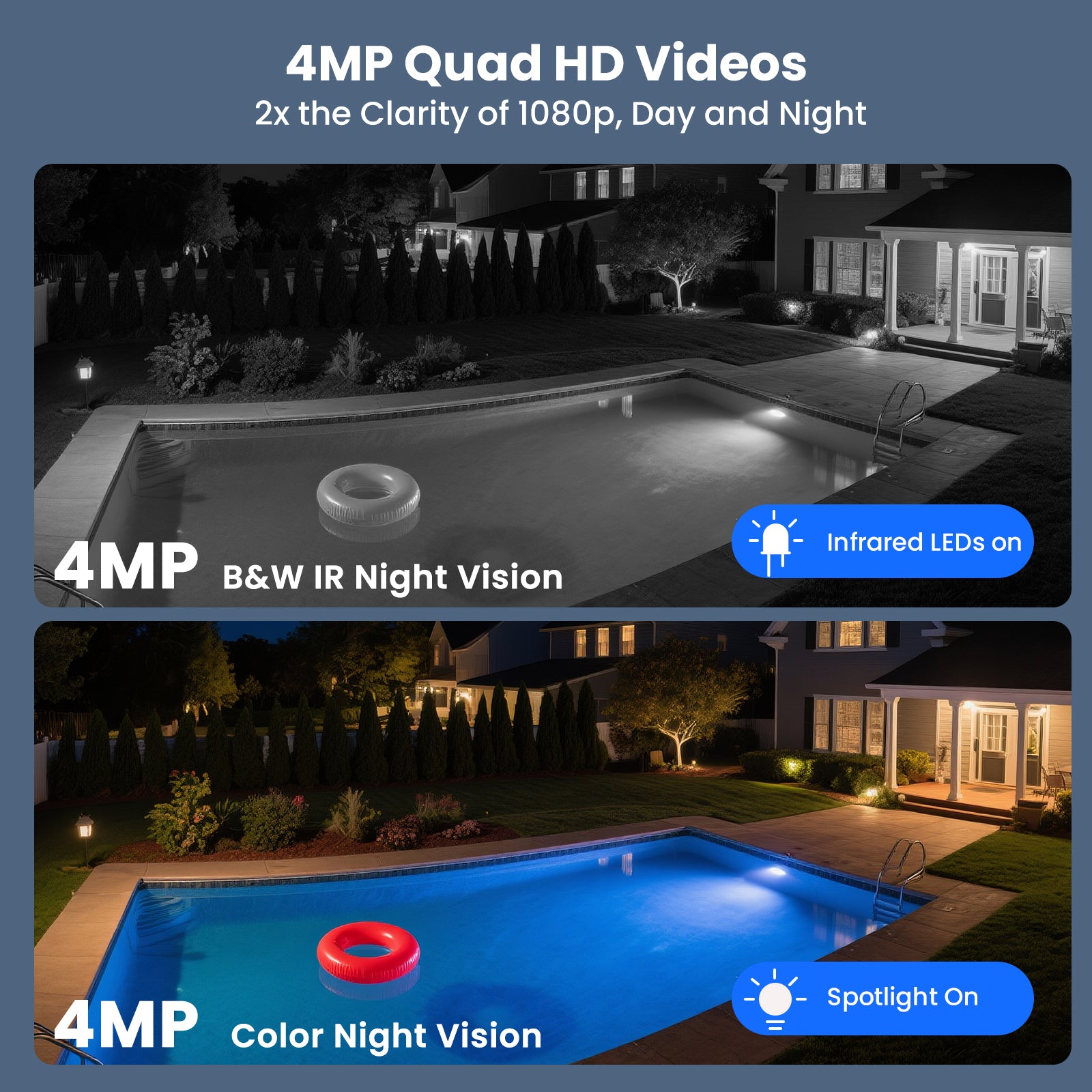 The 4MP cams capture nice videos with 2x pixels of 1080p, with help of IR LED & spotlights at night.
