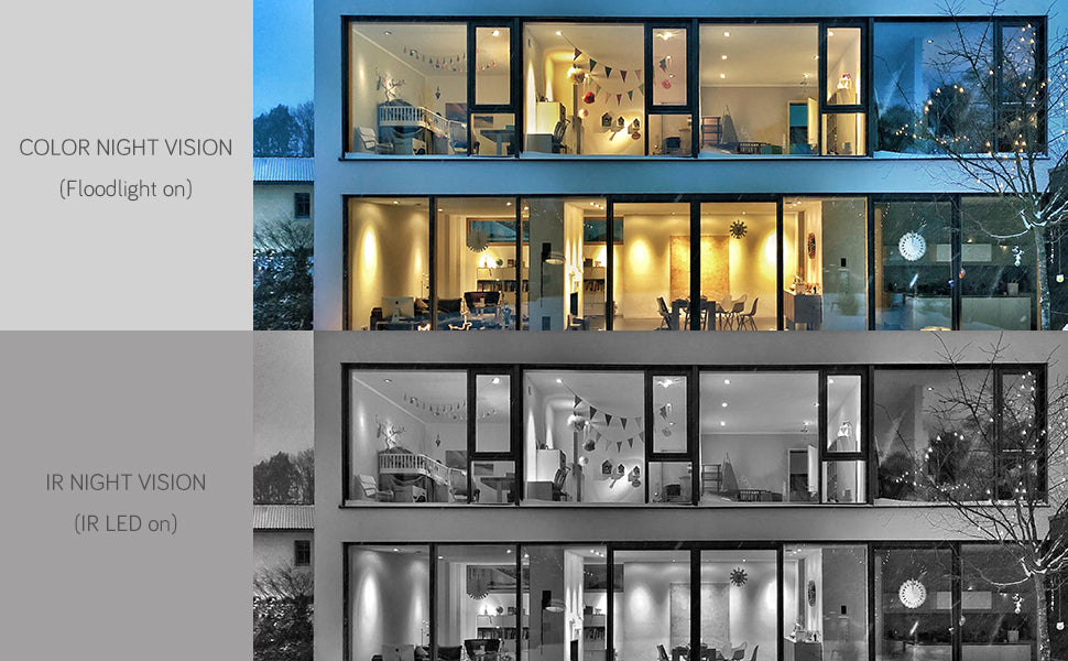 Spotlight and Siren alarm on security camera: Once any moving objects are trigged, the camera automatically turn on the 4 LED flood light at night and the auto siren can deters intruders away if you have already turn on the motion-triggered siren.
