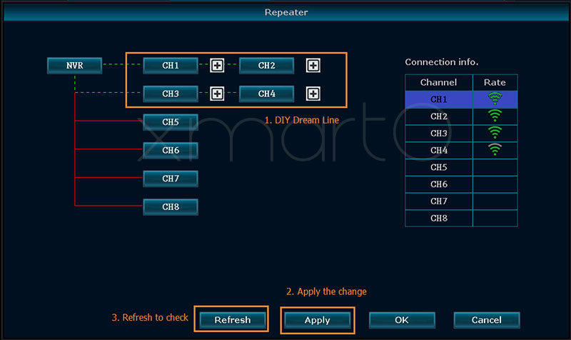 a) Consider your planned mounting spots of cameras. If you've already mounted all cameras, decide which camera you want to use as repeater.Generally speaking, cameras with less obstacles to NVR, or closer to the NVR, are wise choices to play as repeates.