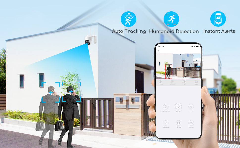 Powered with AI human detection, when people detected, the camera captures a human shape and send instant notification to your phone. It can reduce the false alarm.